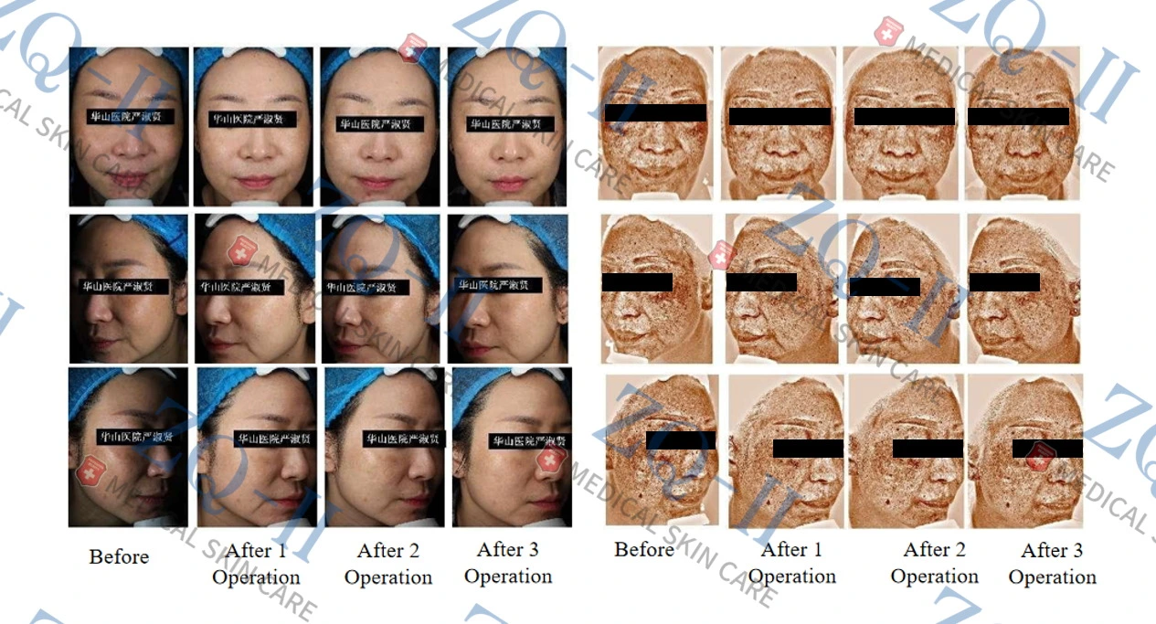 En 46 år gammel pasient har melasma med tilbakevendende ansiktsutslett i nesten 10 år gjennomgikk tre økter med mesoterapi medPLLA -næringsstoffer fylles(inneholder TXA)om tre måneder. Etter tre måneder viste huden hennes: