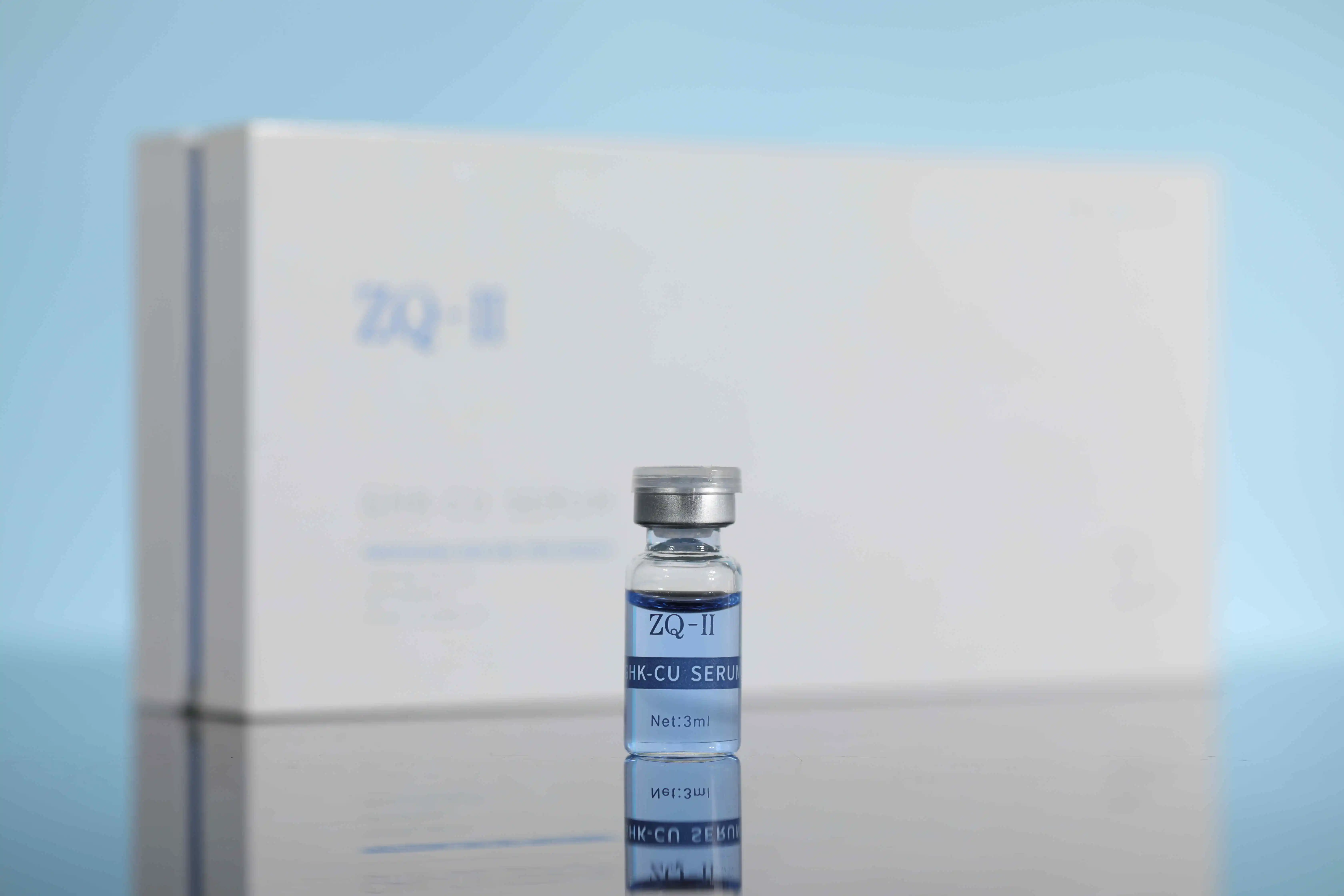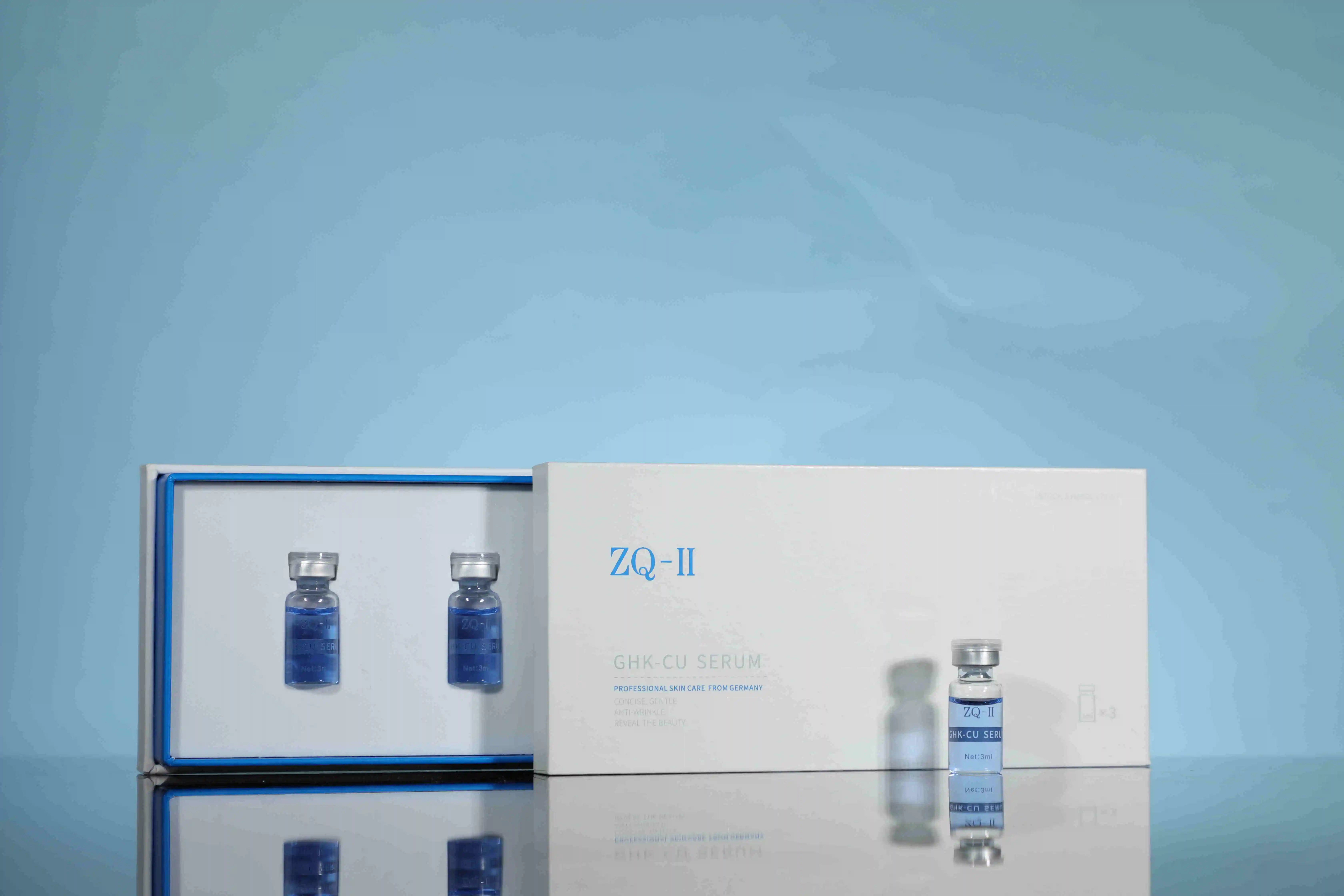 Hvorfor kalles de "Kobberpeptider"Eller"blå kobberpeptider"? Når de er blandet med vann, gjør de denne nydelige blå skyggen. Det er magien med kobberioner som binder seg med tripeptidstrukturen. Du vil ofte oppdage dem oppført som GHK-CU på produktetiketter som somZQ-II GHK-Cu-serum.