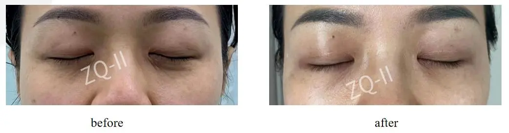 Behandling: Operert ZQ-II PLLA-næringsstoffer fylles 3 ganger innen 6 måneder Etter: Fine linjer og mørke sirkler rundt øynene blir synlig falmet ut