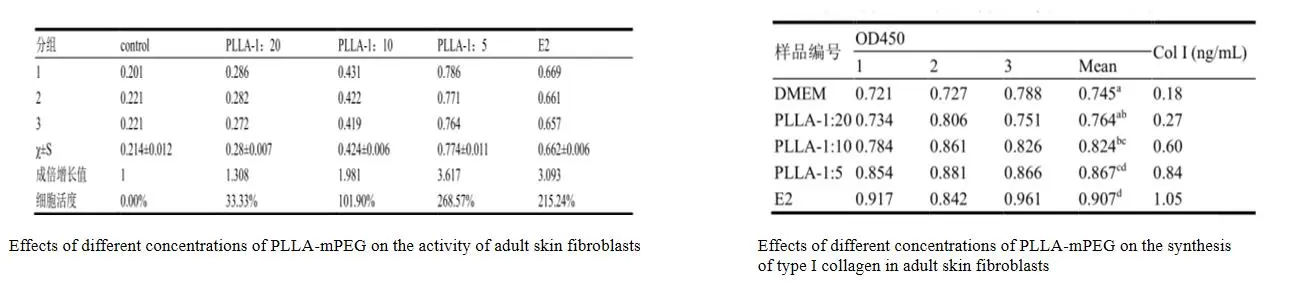 For å observere effekten av ZQ-II PLLA-næringsstoffer fyller utKollagenregenerering, forskjellige konsentrasjoner av PLLA-MPEG på aktiviteten tilVoksne hudfibroblaster og syntese av type I kollagenble påvist av MTT og ELISA. Etter å ha blitt behandlet med PLLA-MPEG, øker antallet celler betydelig, og øker med økningen av PLLA-MPEG innen et visst område, noe som indikerer at PLLA-MPEG kan fremme voksenhudfibrogenese celleproliferasjon i voksenhud i voksenhud i voksenhudfibras.